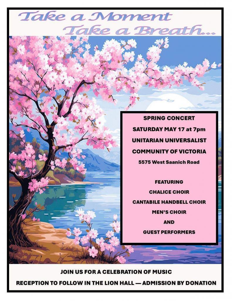 Our Spring Concert returns on Saturday, May 17 at 7:00 p.m. at the Unitarian Universalist Community of Victoria, located at 5575 West Saanich Road.